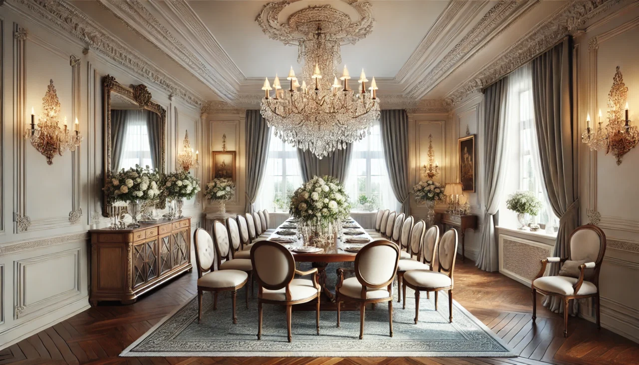 DALL·E 2025-01-23 12.03.25 – An elegant dining room with a luxurious, sophisticated atmosphere. The room features a long wooden dining table with a polished finish, surrounded by